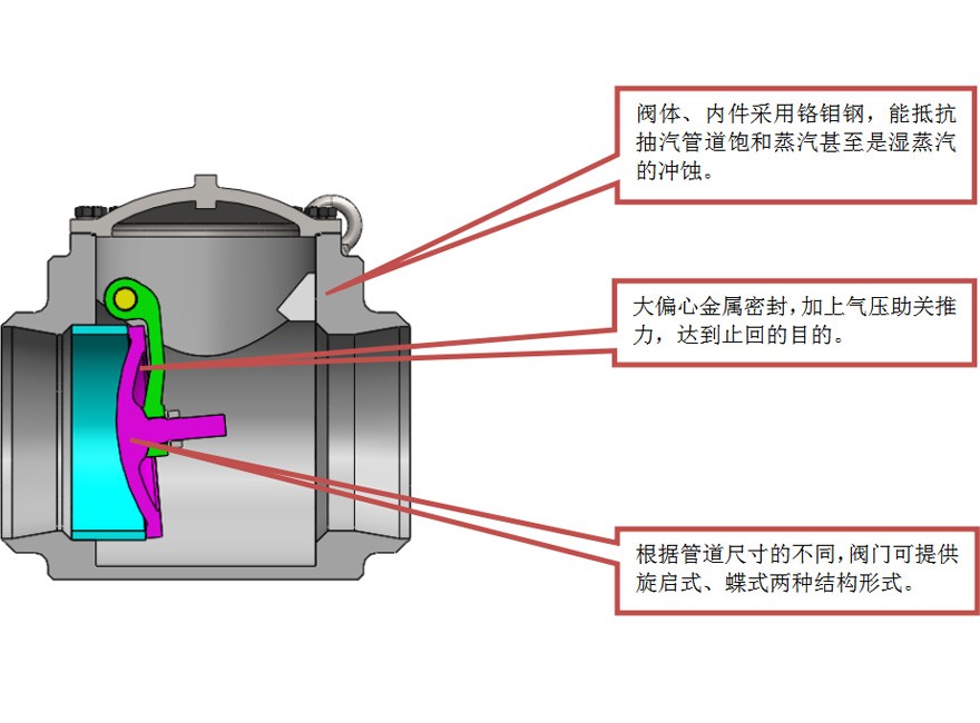 驅動方式:氣動操作,并可根據(jù)用戶管道布置,執(zhí)行機構由頂裝、側裝可供選擇;另外,也可根據(jù)用戶需要提供無執(zhí)行機構的抽汽止回閥。