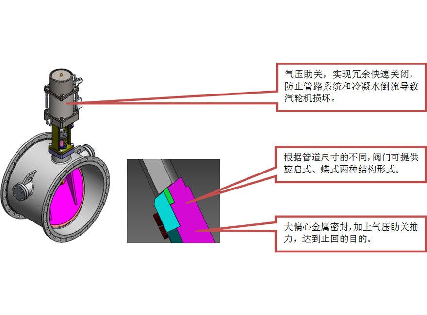 適用于緊急止回或電廠汽輪機抽汽管路,其功能為0.5s快關關閉,防止管路系統和冷凝水倒流導致汽輪機損壞;