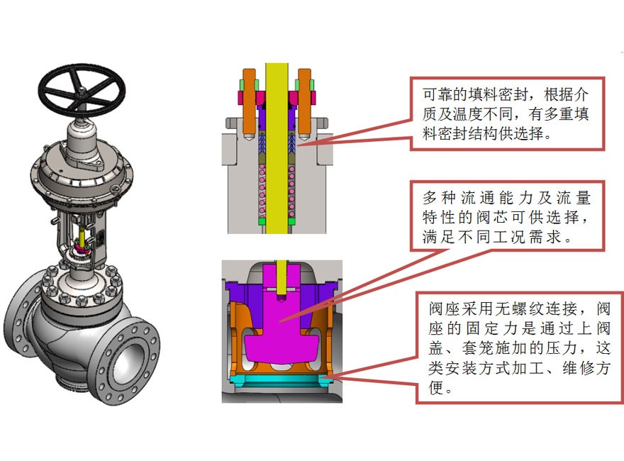 閥體結(jié)構(gòu)緊湊,流體通道呈S流線型,壓降損失小,流量大,可調(diào)范圍廣,流量特性精度高,閥芯導(dǎo)向面積大,抗震性好。
