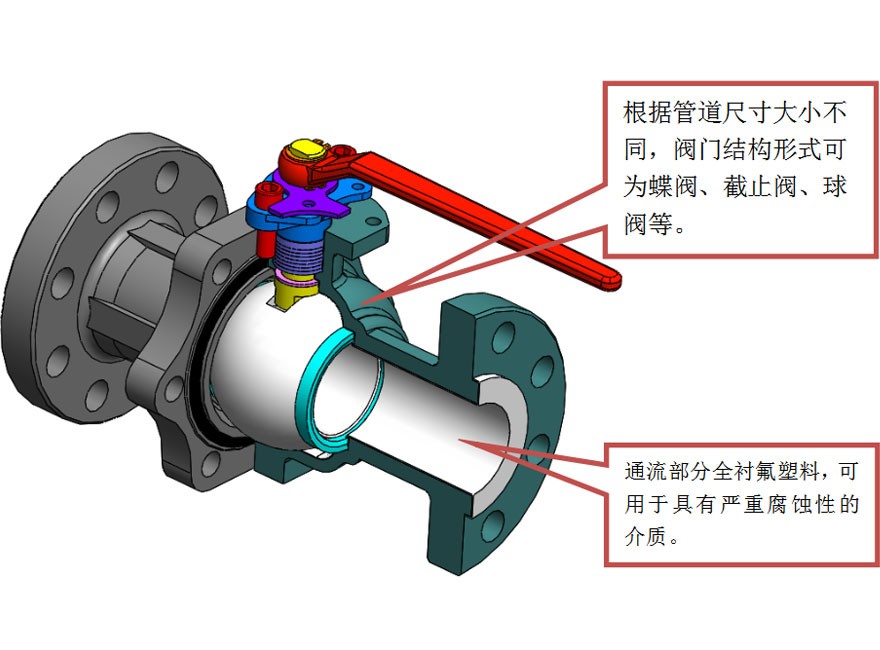 不同結構形式閥門供選擇:根據管道尺寸大小不同,閥門結構形式可為蝶閥、截止閥、隔膜閥、球閥等。
